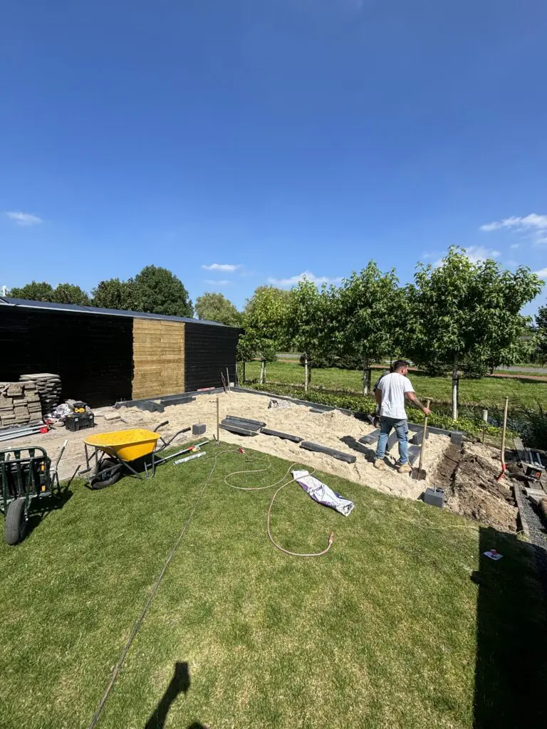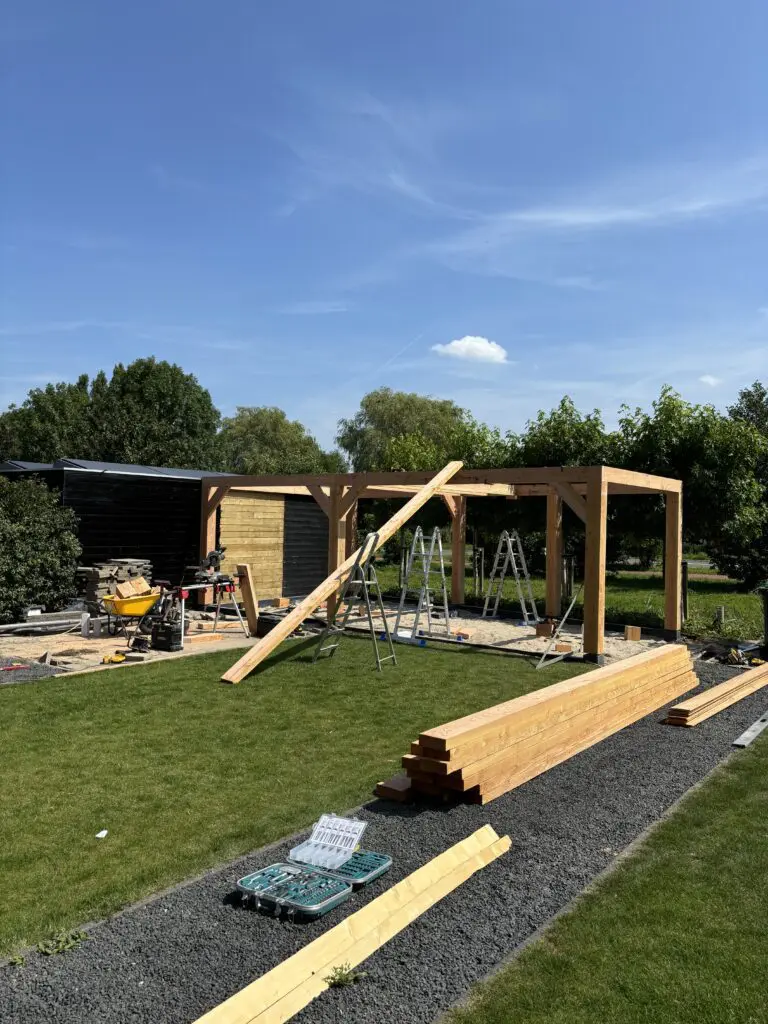 We realiseerden een maatwerkoverkapping opgebouwd uit zware Douglas balken van 20×20 cm, voor een robuust en ambachtelijk karakter. De constructie is volledig waterpas geplaatst, ondanks de hellende tuin, door middel van een zorgvuldig uitgegraven en verstevigde fundering.