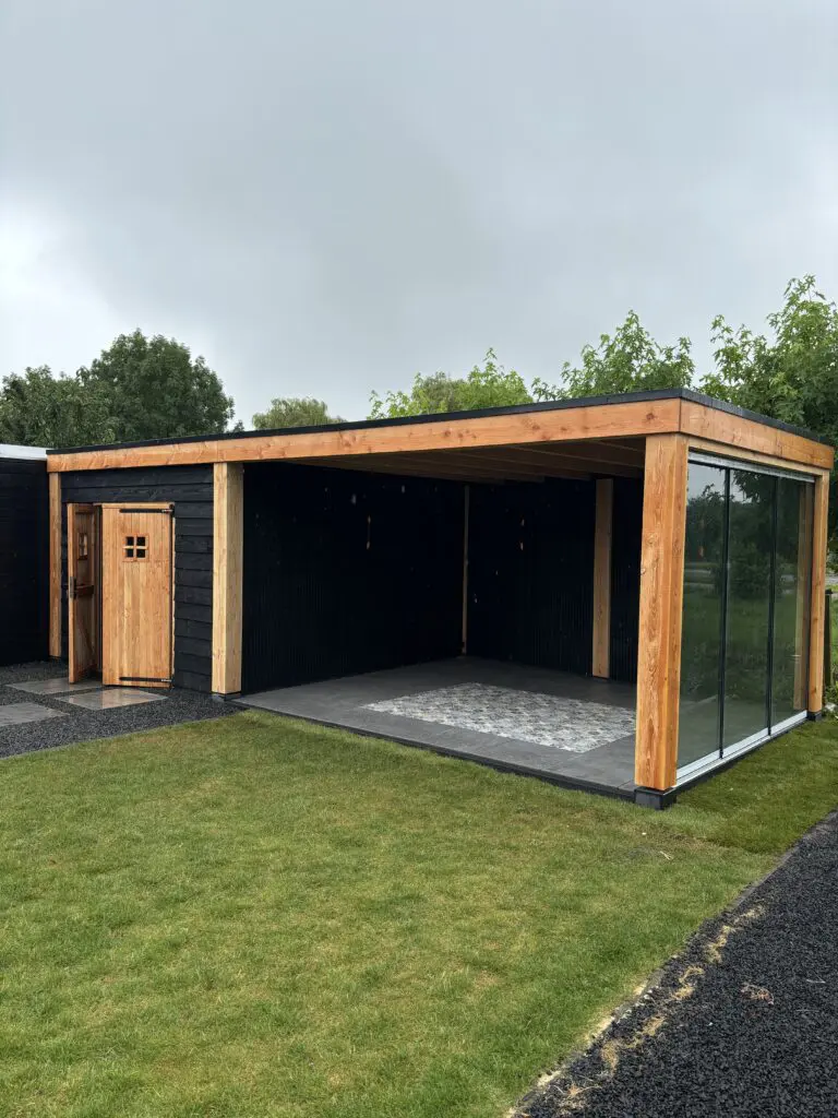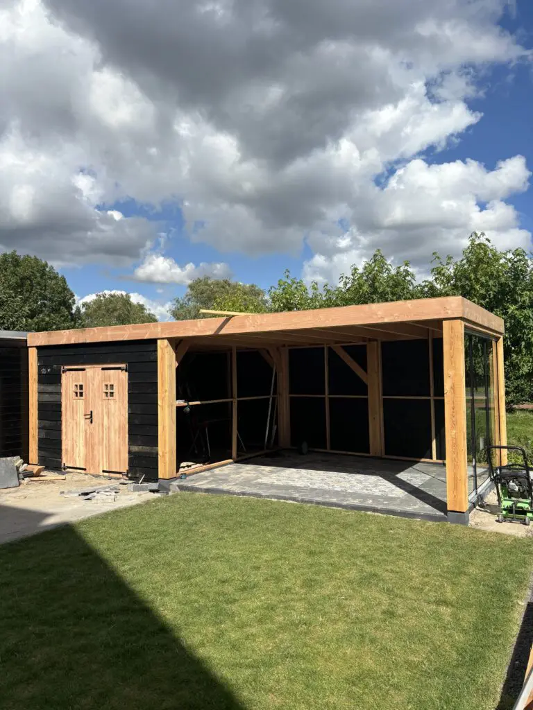 De klant wilde een ruime, stijlvolle overkapping met een hoogwaardige afwerking die past bij de natuurlijke ligging van de tuin. De schuine ondergrond en beperkte stabiliteit aan de waterzijde vormden de grootste technische uitdaging. Doel: een solide constructie met moderne uitstraling, geschikt als volwaardige buitenruimte, beschut, duurzaam en in harmonie met de omgeving.