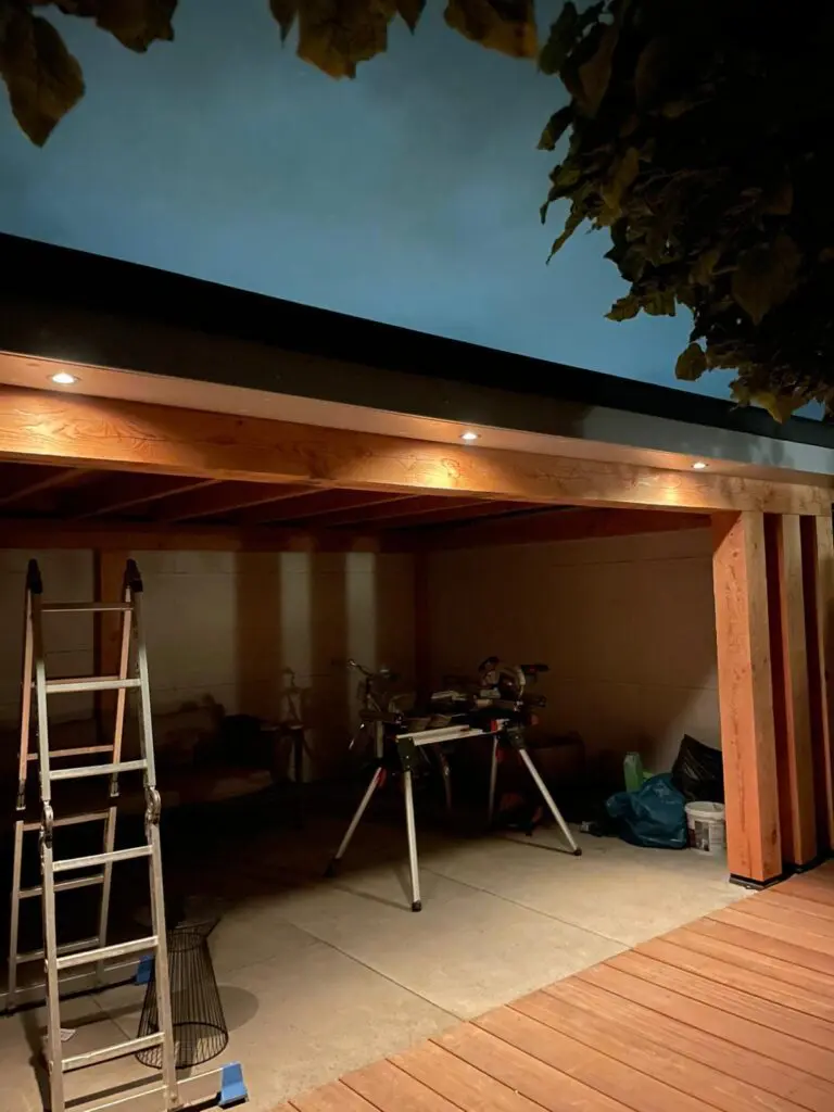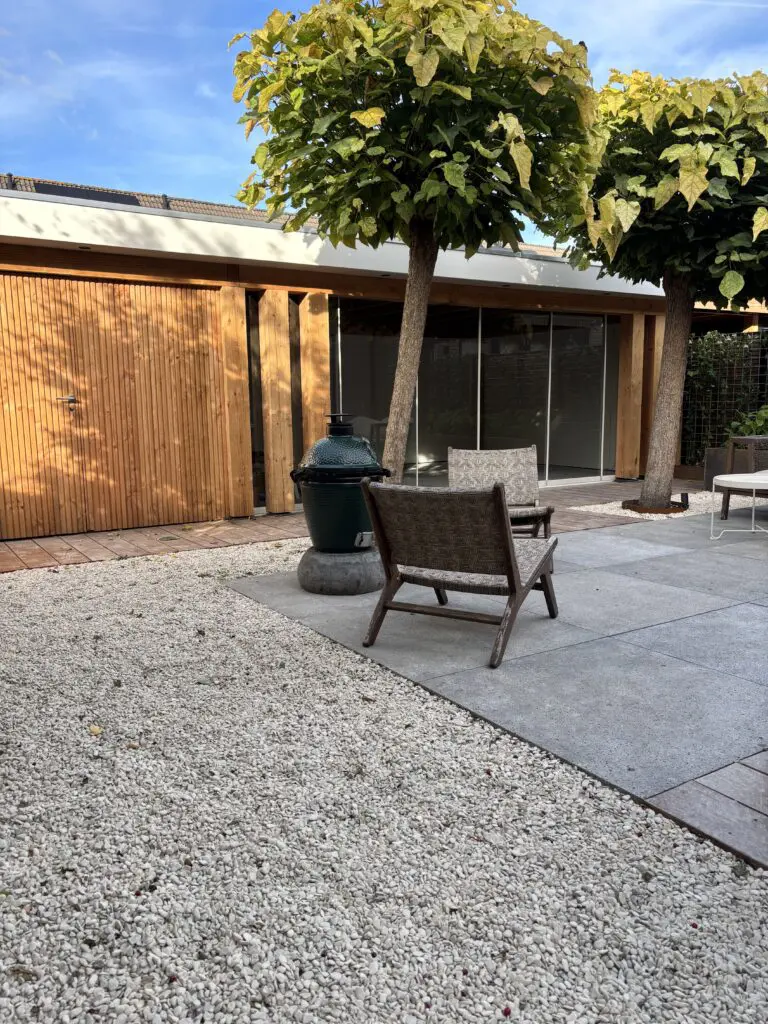 We hebben de oude schuur en beplanting verwijderd en de fundering opnieuw uitgegraven om plaats te maken voor een maatwerk overkapping met gestuucte wanden, een buitenkeuken en geïntegreerde verlichting. De tuin is volledig bestraat, en er zijn cortenstalen borders en plantenbakken geplaatst voor een moderne en onderhoudsvriendelijke afwerking. Daarnaast is het grind vernieuwd en is de voortuin aangepakt, zodat het geheel een samenhangend en esthetisch geheel vormt.