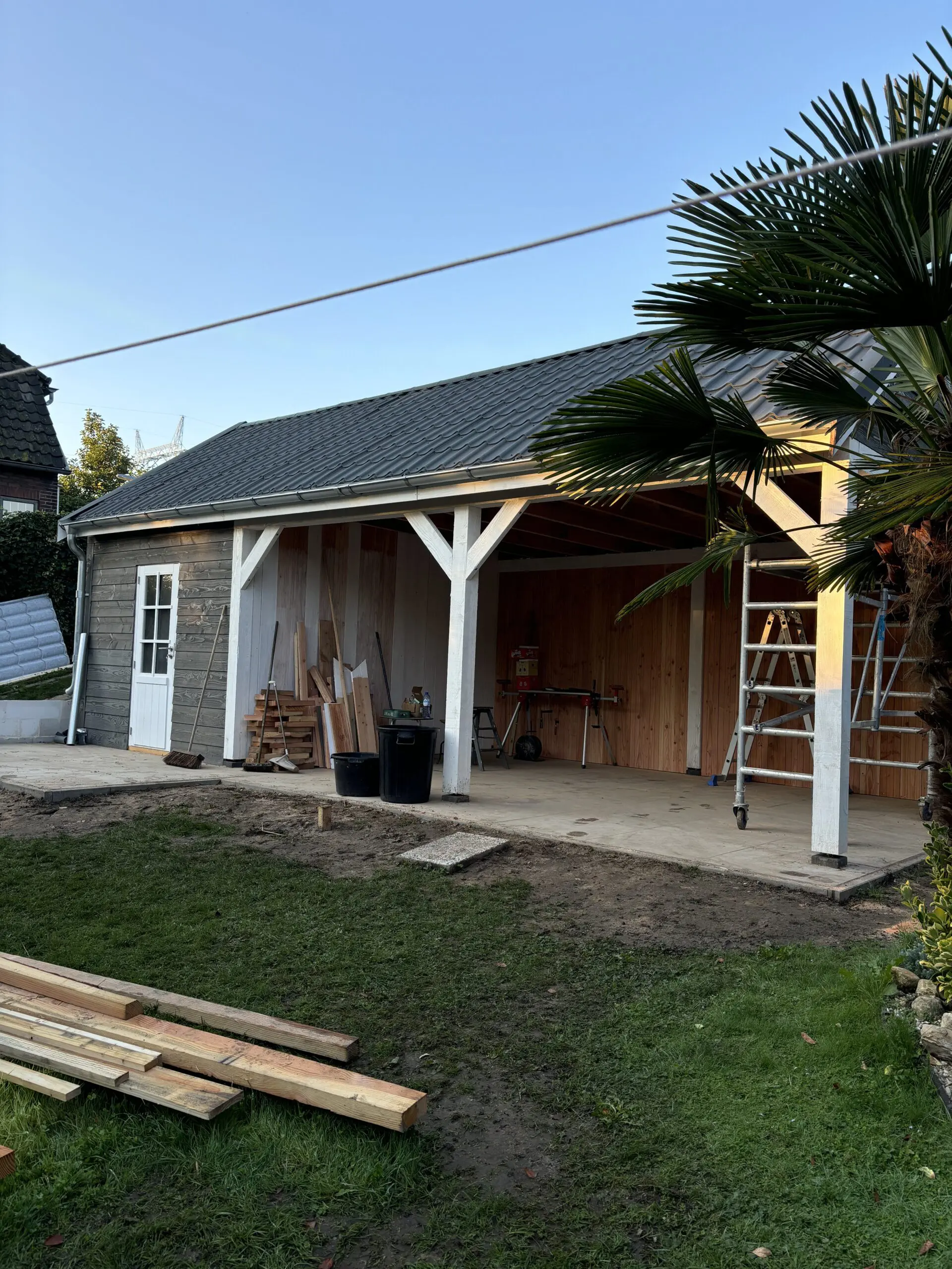 In Rotterdam hebben we een groot tuinhuis met zadeldak gerealiseerd, ontworpen om zowel extra bergruimte als een comfortabele zitplek te bieden. De klant wilde de tuin optimaal benutten met een praktische en sfeervolle toevoeging.